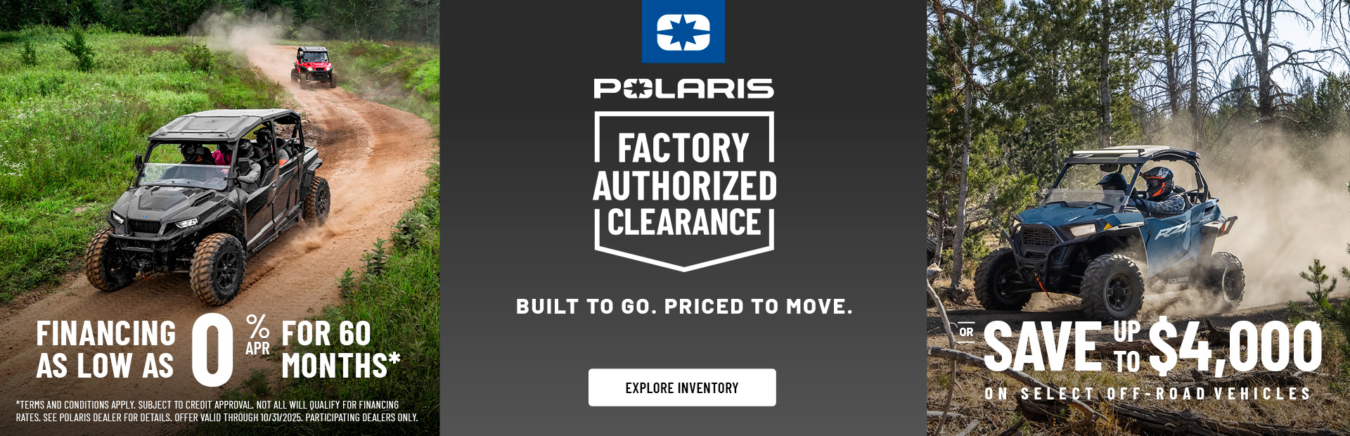 **Financing available on 2025 new and unregistered Polaris® RZR®, RANGER®, Sportsman®, GENERAL® models purchased between 10/1/2025 - 10/31/2025. Rates as low as 0.00% APR for 60 months. Examples of monthly payments required over a 60‑month term at a 0.00% APR rate: $16.67 per $1,000 financed. An example of a monthly payment with $0 down, no rebate, an APR of 0.00% APR for 60 months at an MSRP of $13,999 is $233.32 /mo. Down payment may be required. Other financing offers may be available. See your local dealer for details. Minimum Amount Financed $2,500; Maximum Amount Financed $50,000. Other qualifications and restrictions may apply. Financing promotions void where prohibited. Tax, title, license, and registration are separate and may not be financed. Promotion may be modified or discontinued without notice at any time in Polaris’ sole discretion. Warning: Polaris off-road vehicles can be hazardous to operate and are not intended for on-road use. Driver must be at least 16 years old with a valid driver’s license to operate. All riders should always wear helmets, eye protection and protective clothing and footwear. Read, understand and follow your owner’s manual. Ride within the limits of your own abilities and never engage in stunt or exhibition driving. Never ride under the influence of drugs or alcohol. All riders should take a safety training course. Call 800-342-3764 for additional information. Check local laws before riding on trails.